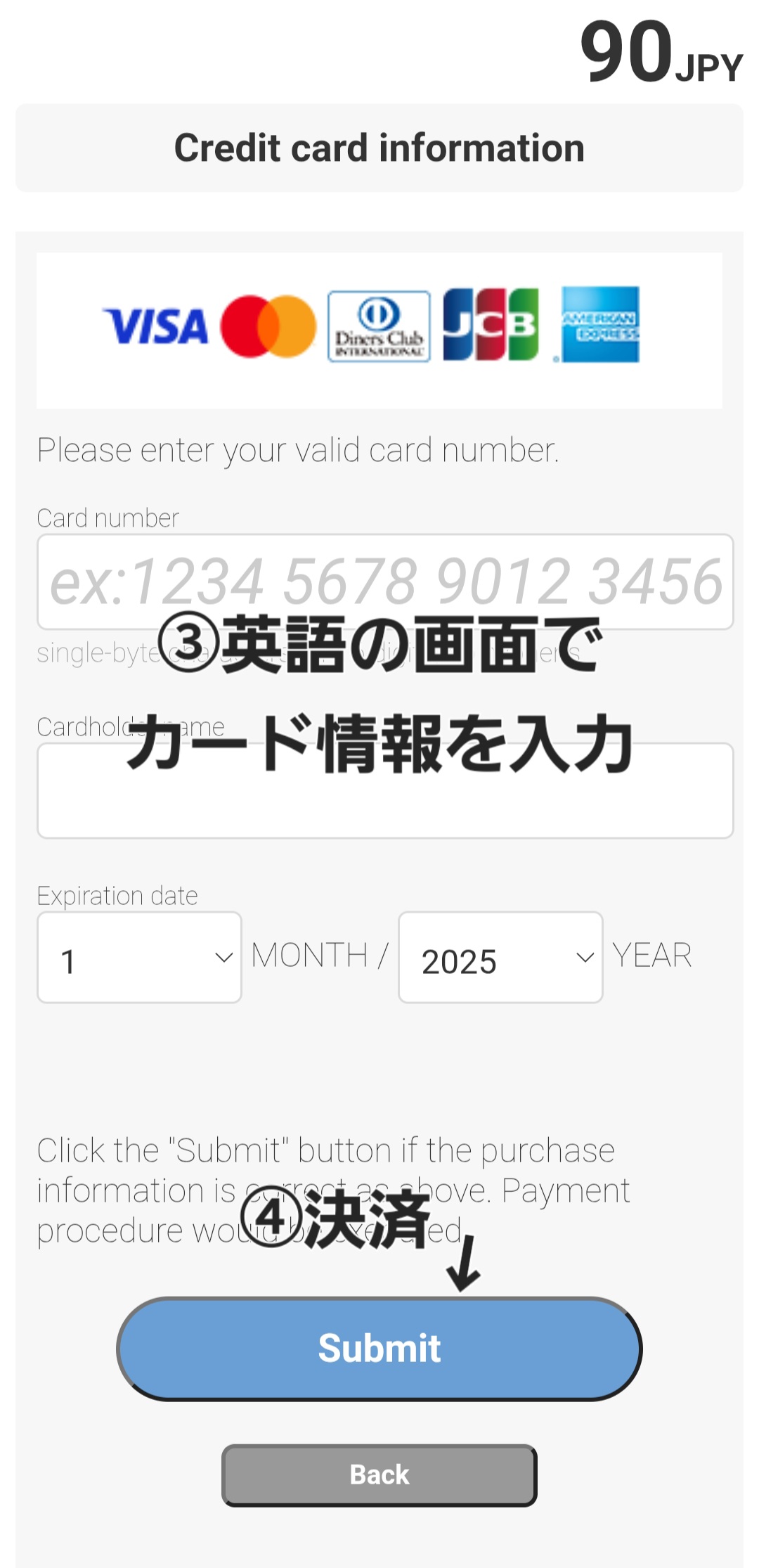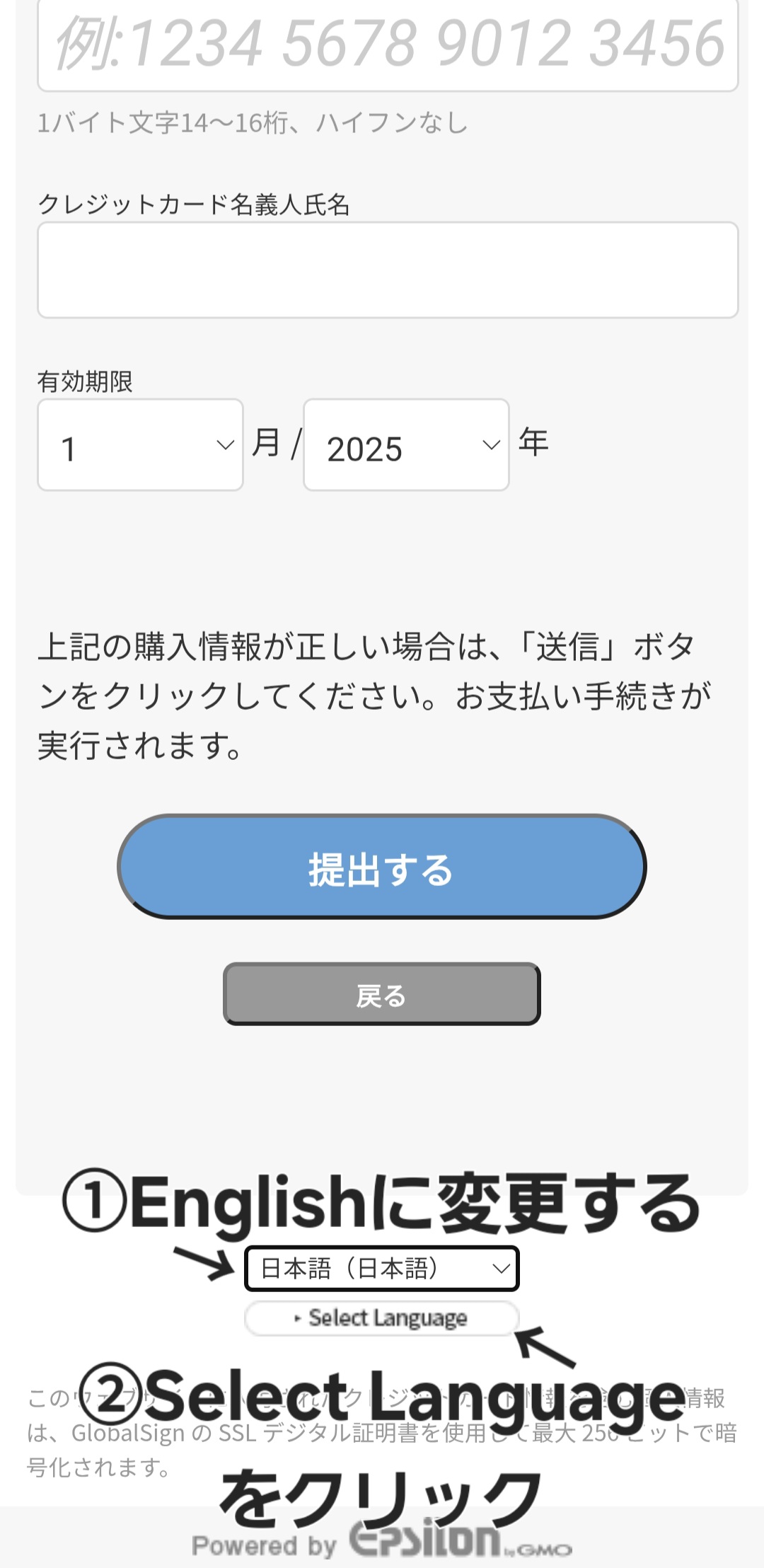 1:クレジットカード情報を入力するページの最下部にある言語設定を「日本語」から「English」に変える