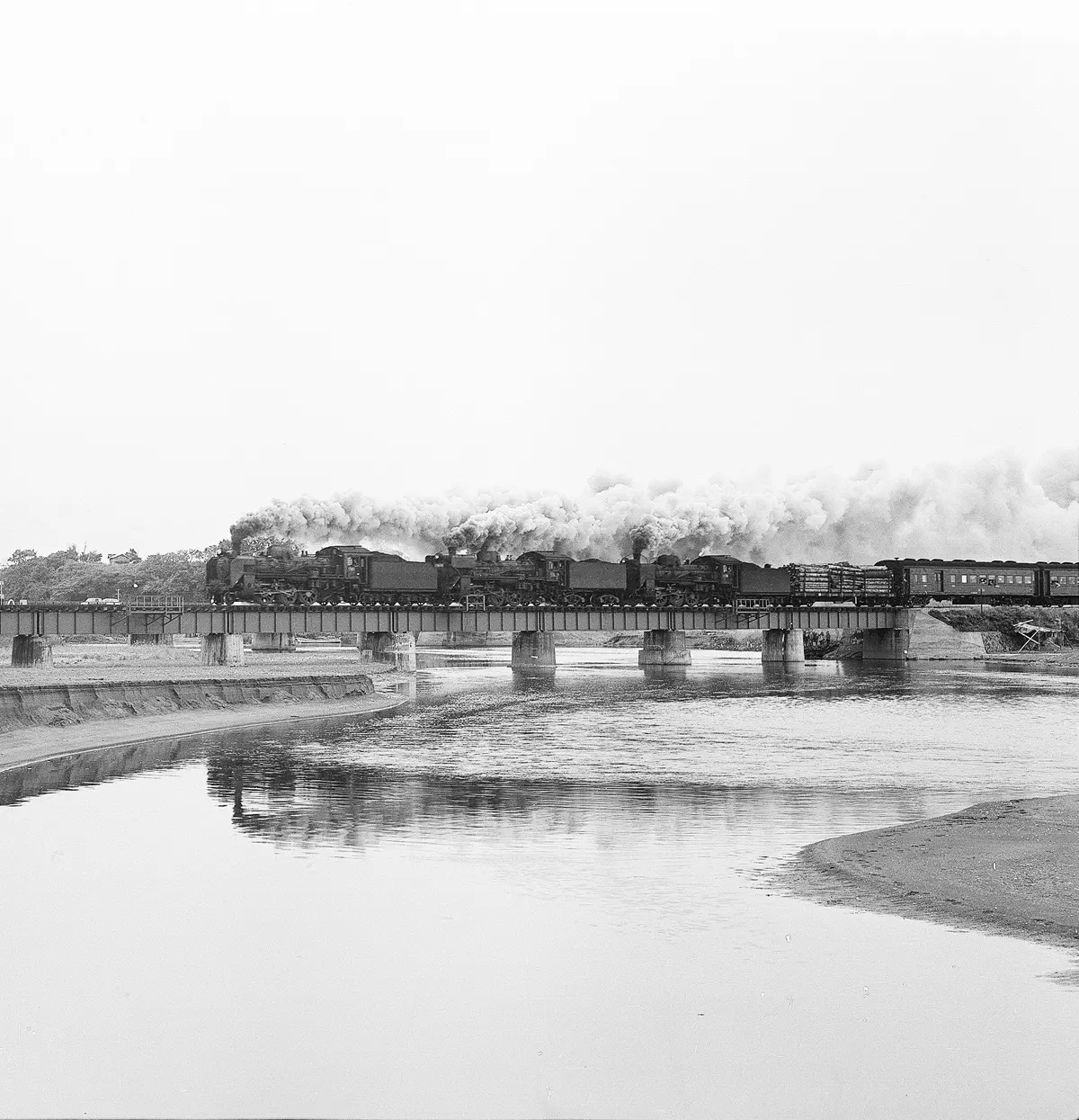 この写真は、オホーツク海沿岸の濤沸湖に架かる橋梁を渡るC58の3重連。先頭はC58-12番目の機関車はデフレクターが特殊な形の「門デフ」と言われる後藤製のC58-385、3番目は判りませんが、デフレクターの前部か切り取られている切り詰め型ですね。